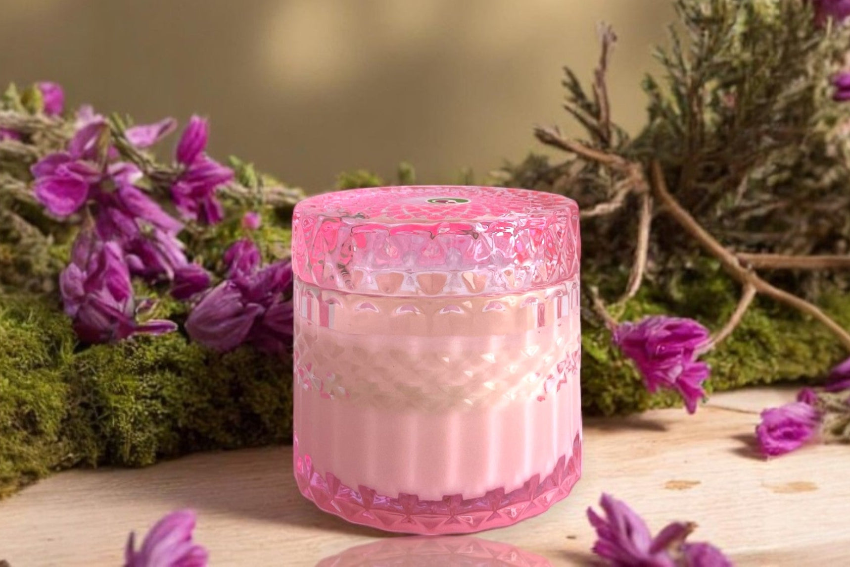 ✔ Envase de vidrio rosado con tapa, ideal para decoración refinada.